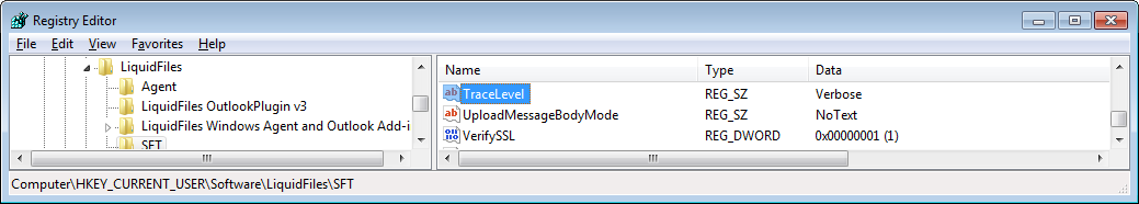 regedit, create registry key HKEY_CURRENT_USER\Software\LiquidFiles\SFT if it doesn't already exists; - Create a new string value TraceLevel and set its value data to Verbose;
