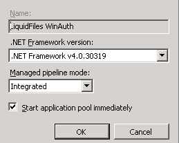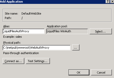 5. Specify Alias for the application, such as LiquidFilesAuthProxy. Specify physical path. Click "Select" button to the right of "Application Pool" to select Application pool created at previous steps.