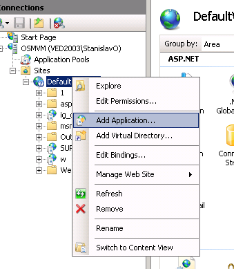 4. Expand "Default website", rightclick it and select "Add application" from context menu.