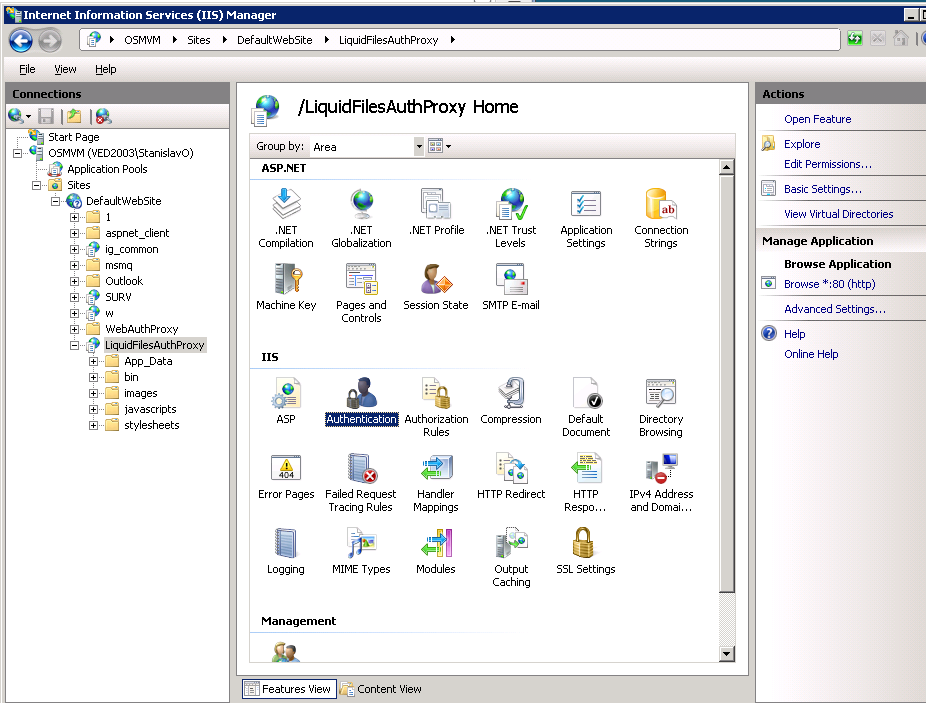 6. Navigate to created application. Locate "Authentication" in Features View. Doubleclick, or click "Open Feature".