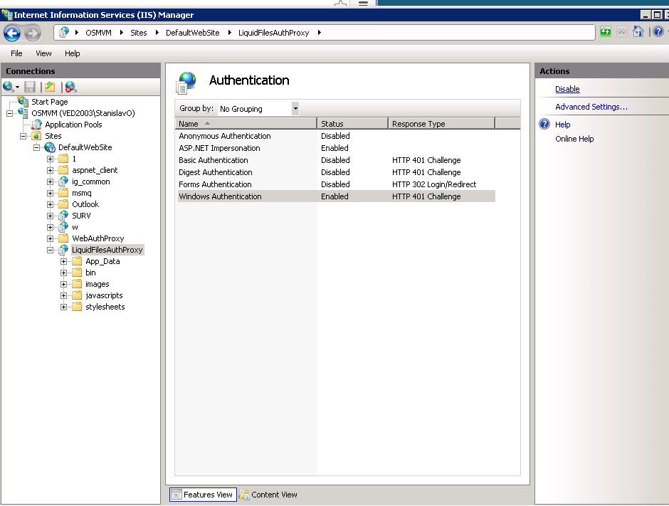 7. Disable Anonymous Authentication by clicking at it and selecting "Disable" on the Action pane to the right. Enable Windows Authentication in the same fashion.